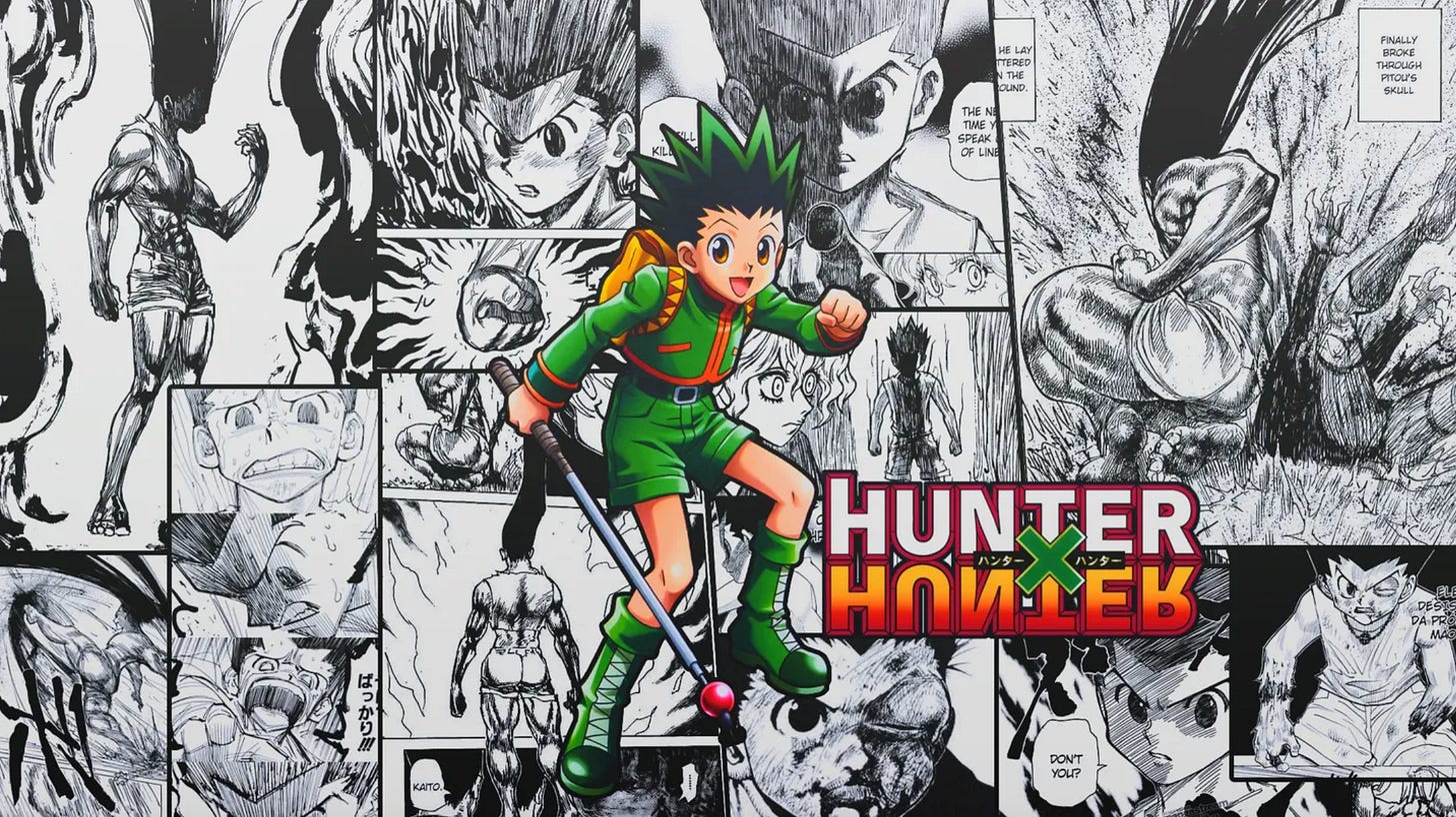 C’est l’histoire de Gon, un enfant qui découvre que son père disparu est un Hunter : un explorateur d’élite. À 12 ans, il quitte son île natale pour le retrouver et découvrir le monde. En passant l’examen des Hunters, il rencontre Killua, Kurapika et Leorio qui progressent comme dans la maîtrise du Nen, la magie de l’aura qui transforme chaque combat en montagne. La naïveté des débuts laisse place à une narration plus sombre, de plus en plus cérébrale, sur la trace du père insaisissable du jeune héros.